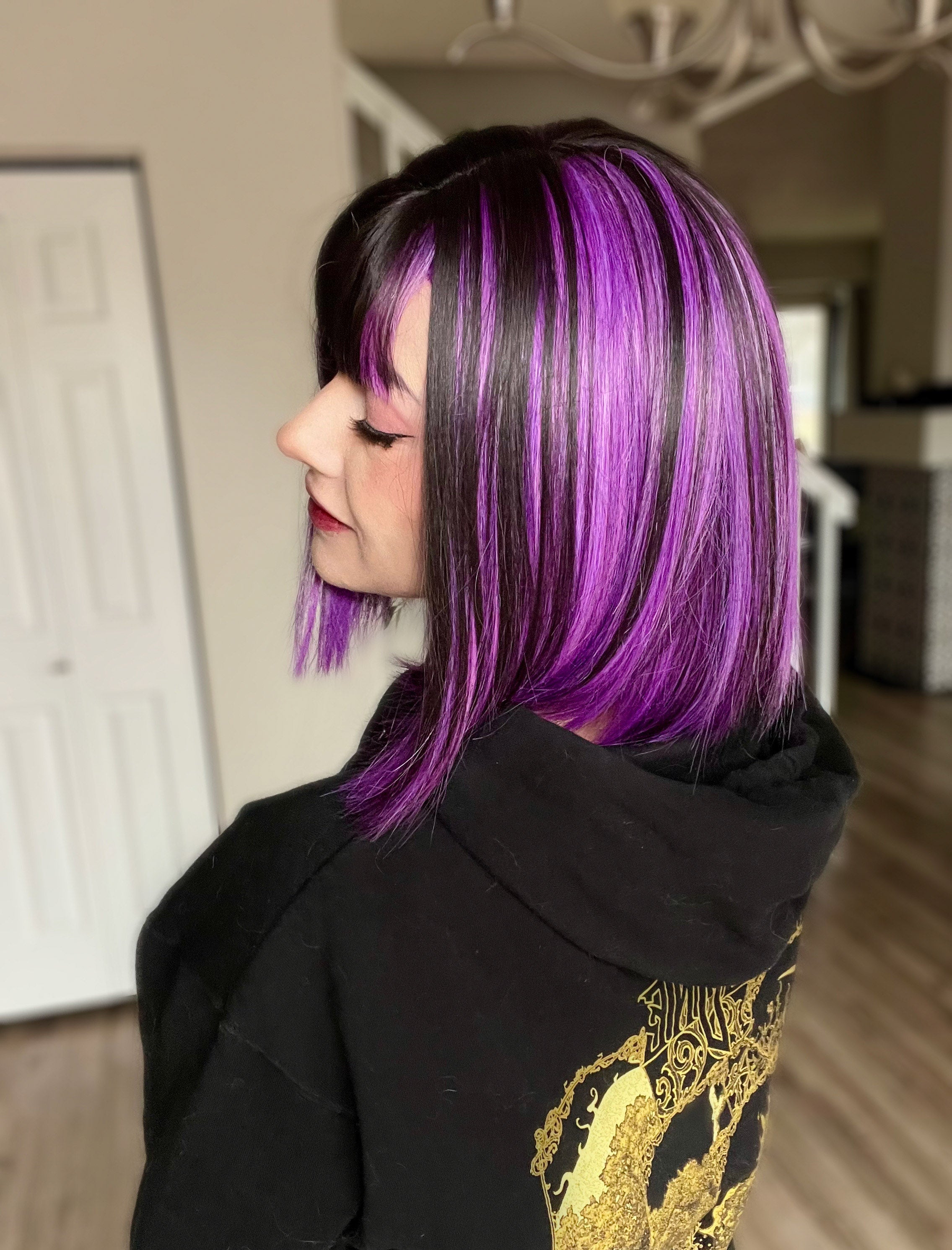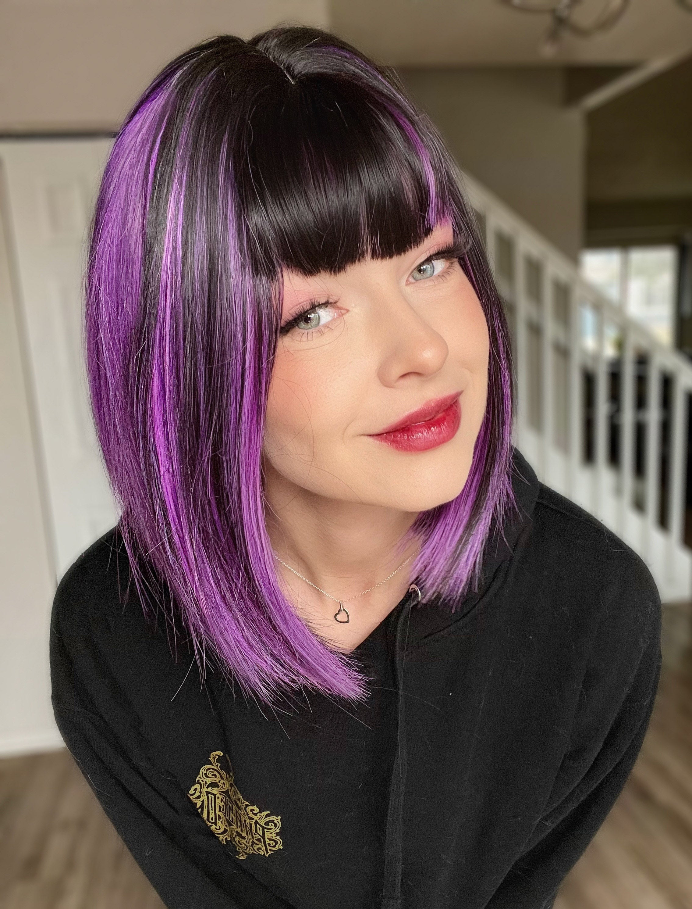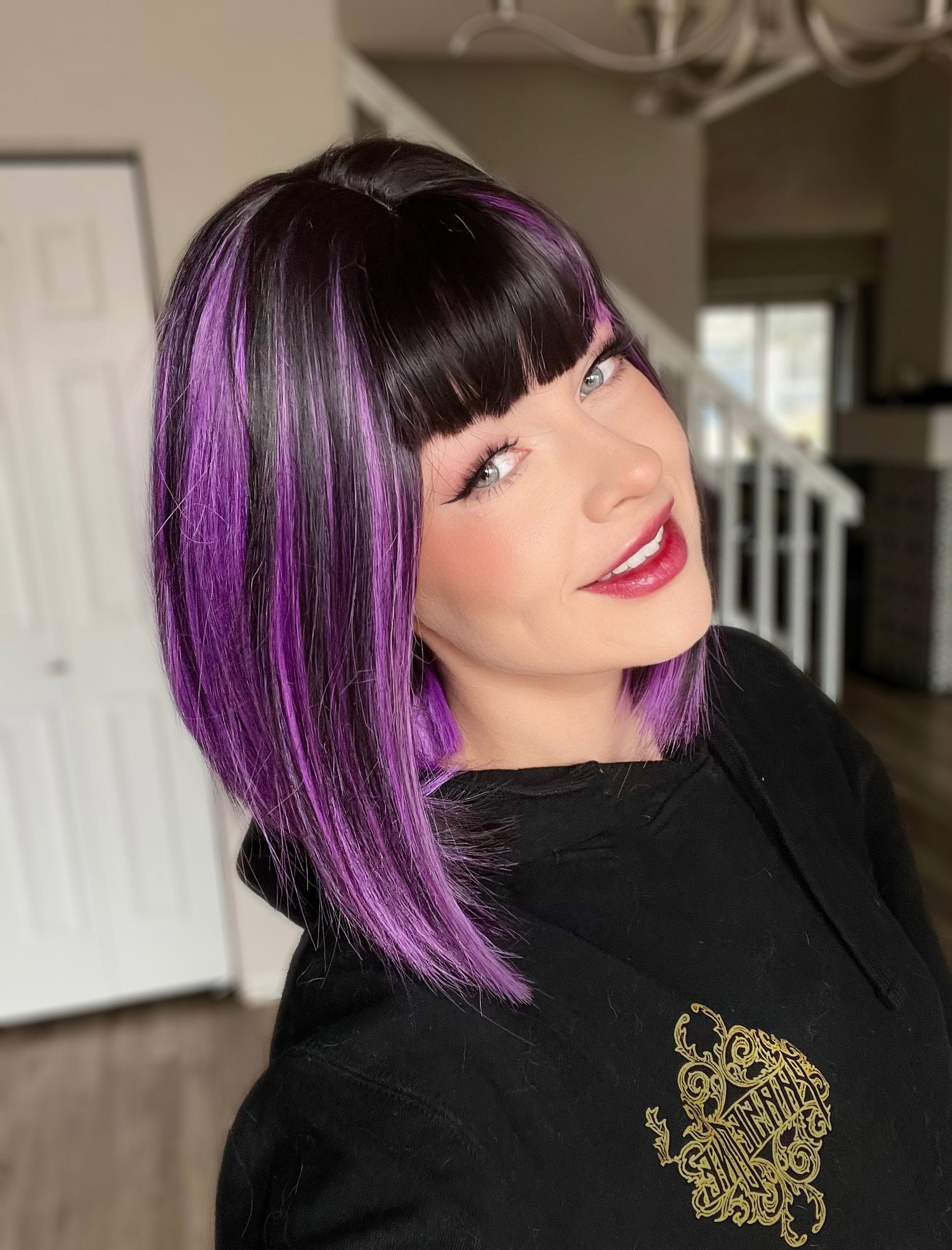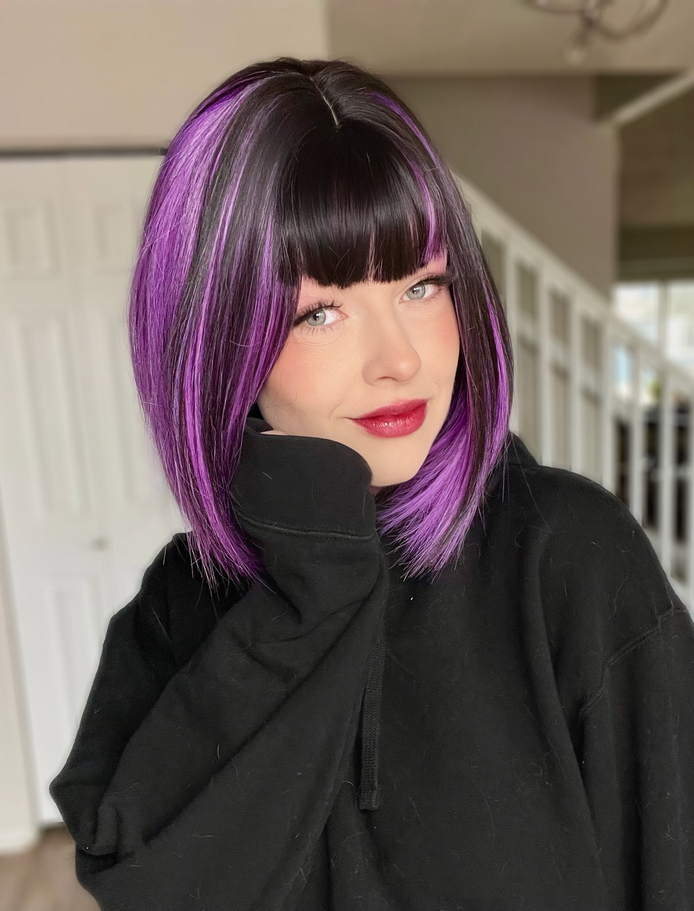 The Yara is a fearless statement piece featuring a striking purple and black bob with blunt bangs that command attention. This daring cut delivers instant edge and transforms your look with unapologetic style!