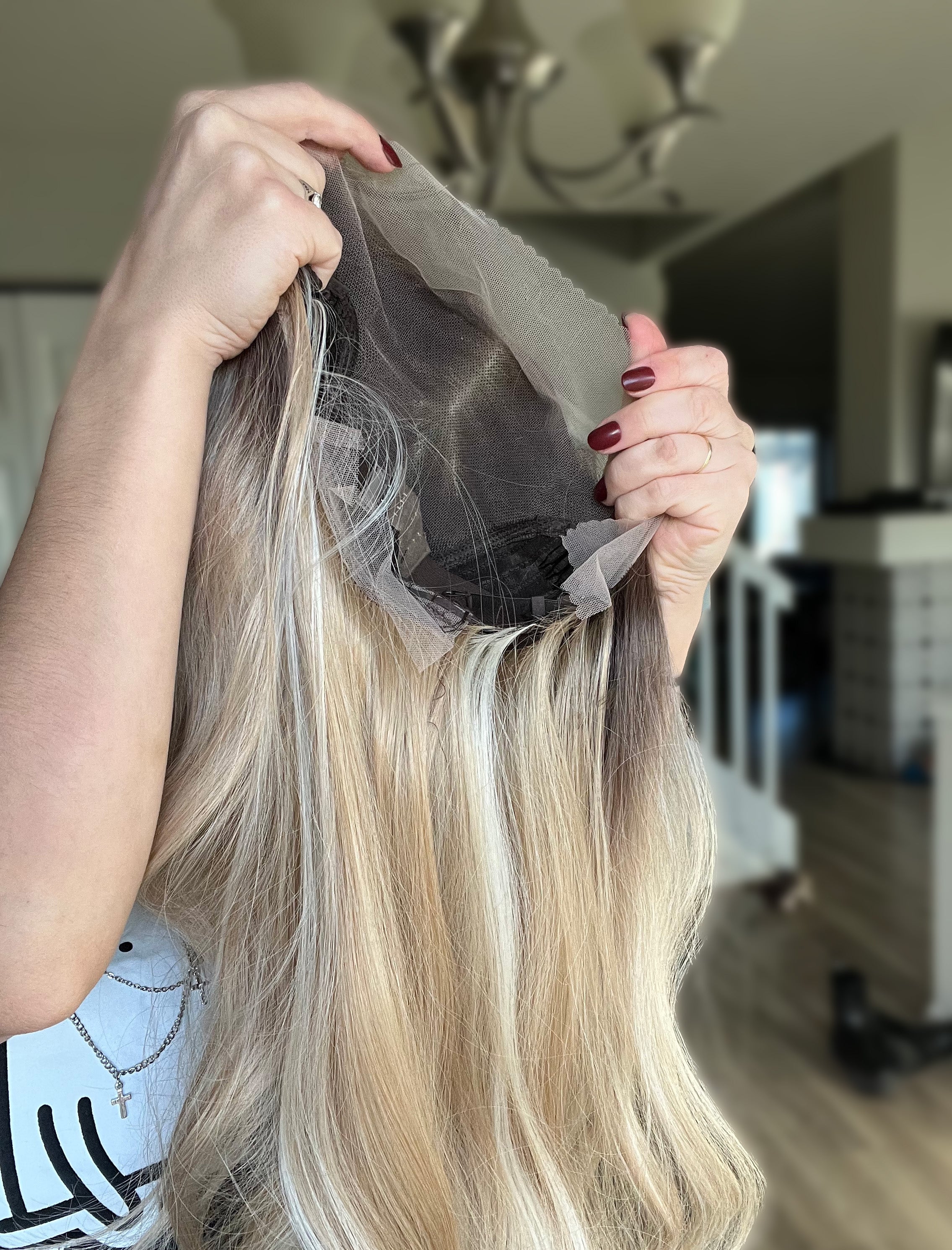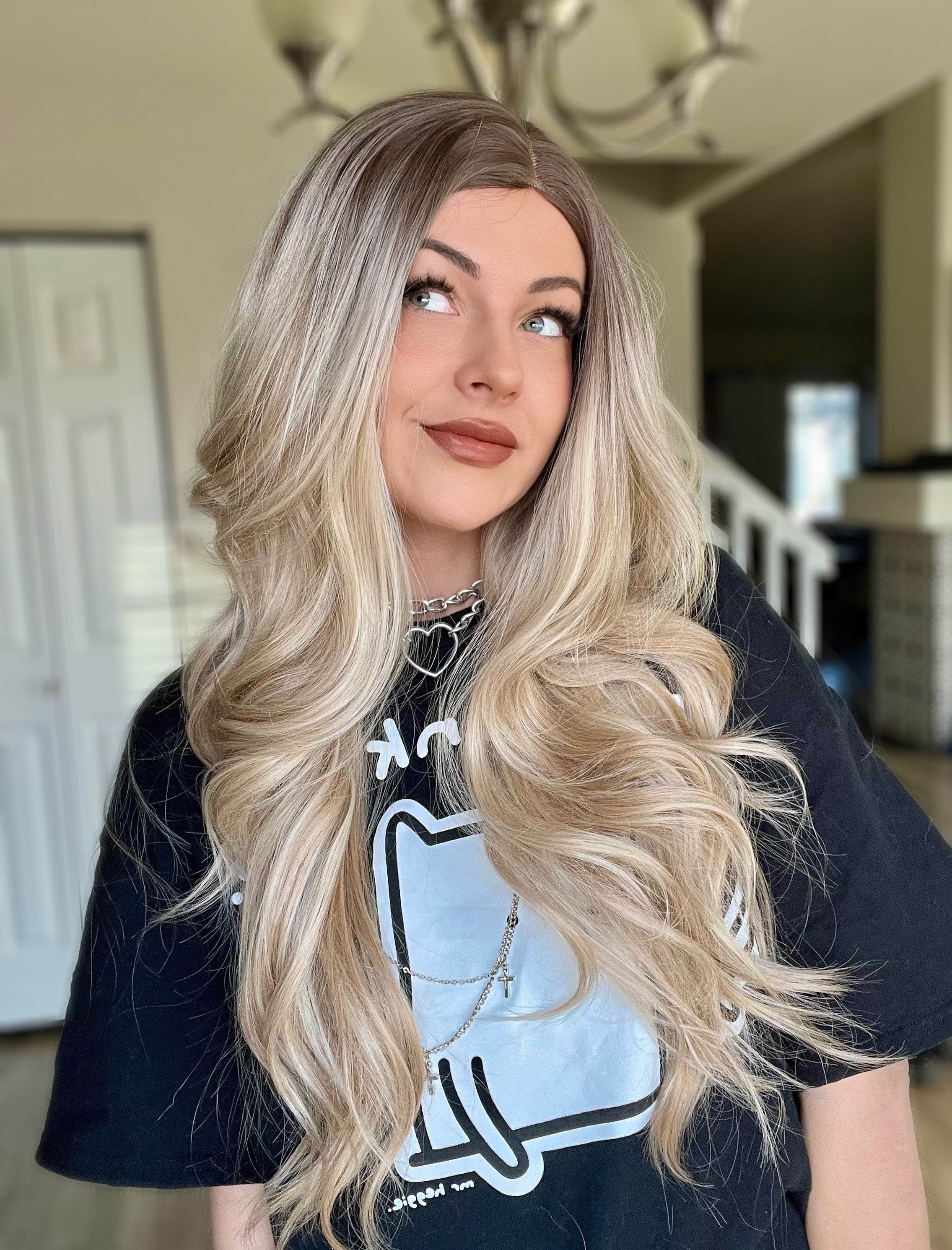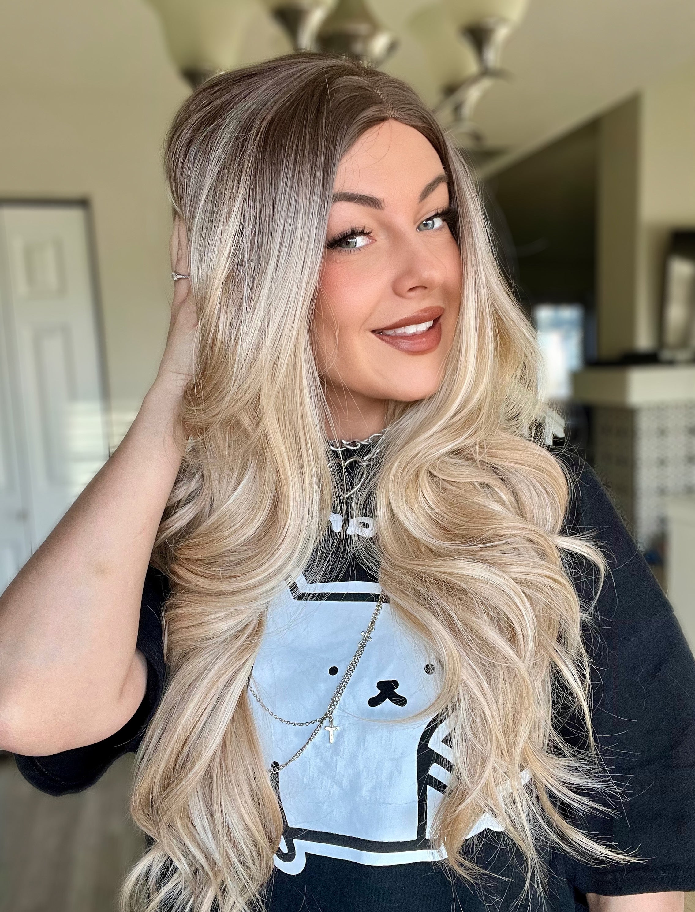 This T lace front blonde wig features expertly blended dark roots that create a sophisticated, multidimensional appearance while maintaining a convincingly natural hairline. Perfect for daily wear.