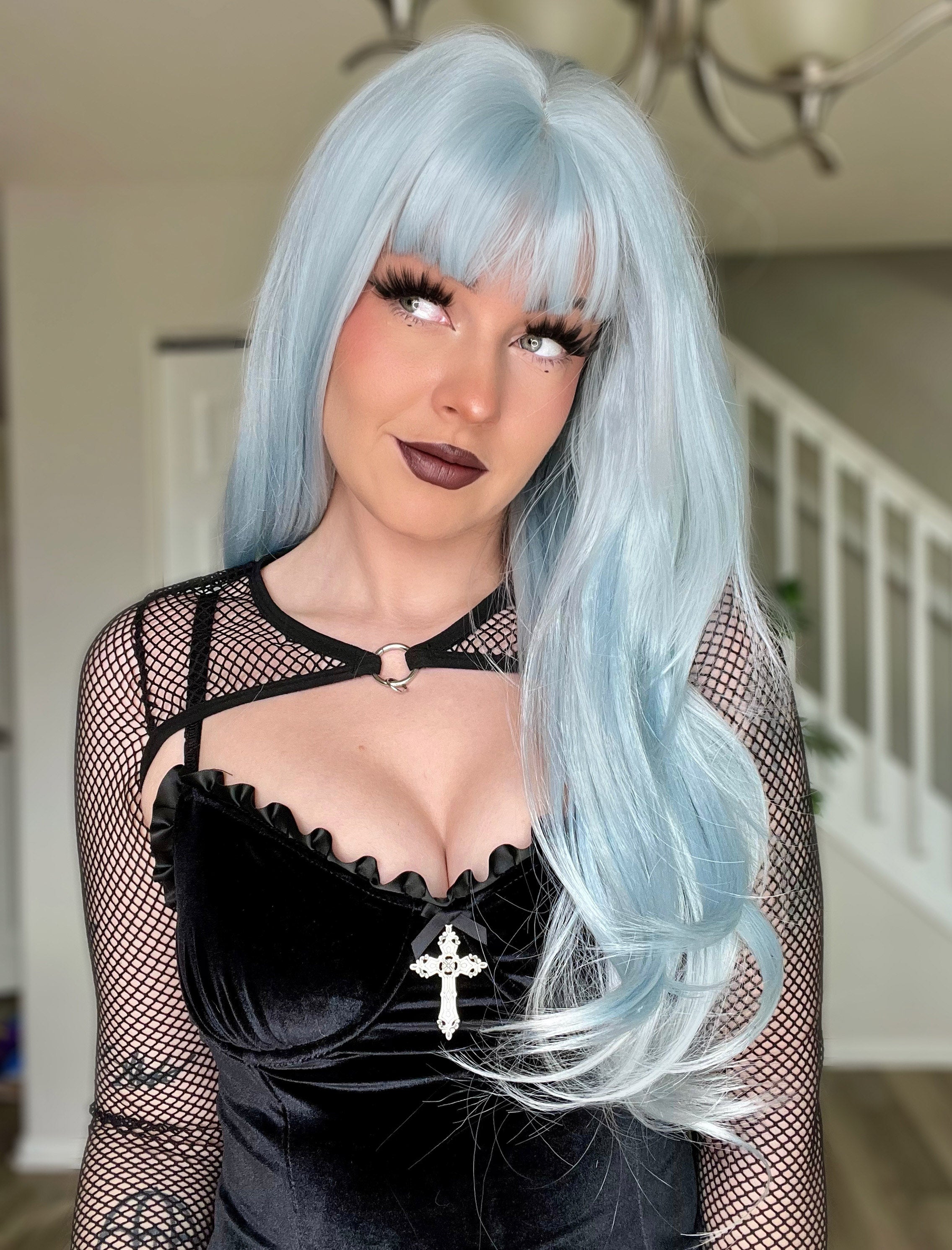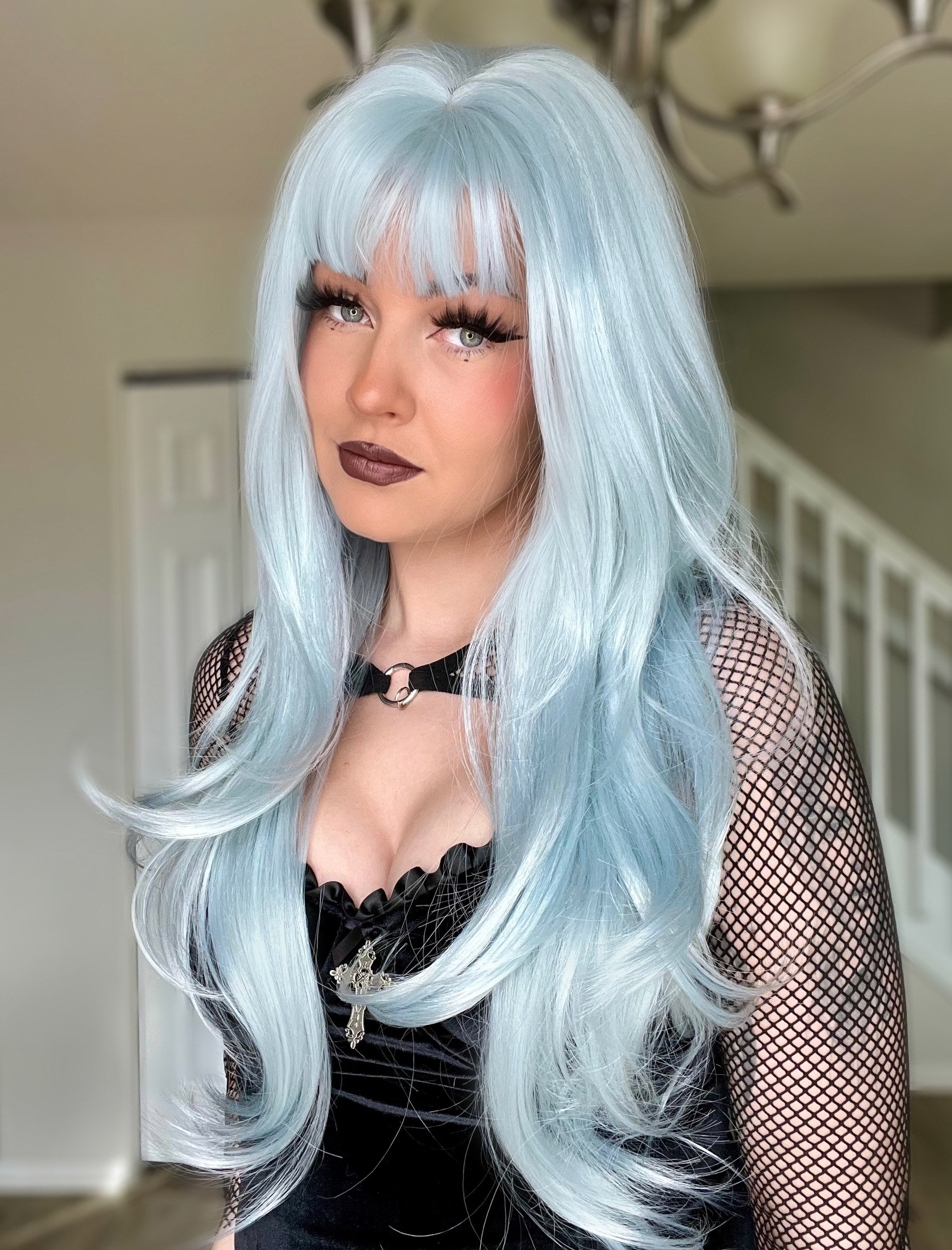 Channel your inner ice queen with these ethereal, pale blue waves and soft matching bangs. It’s a cool, crisp look that brings a breath of fresh air to any outfit.