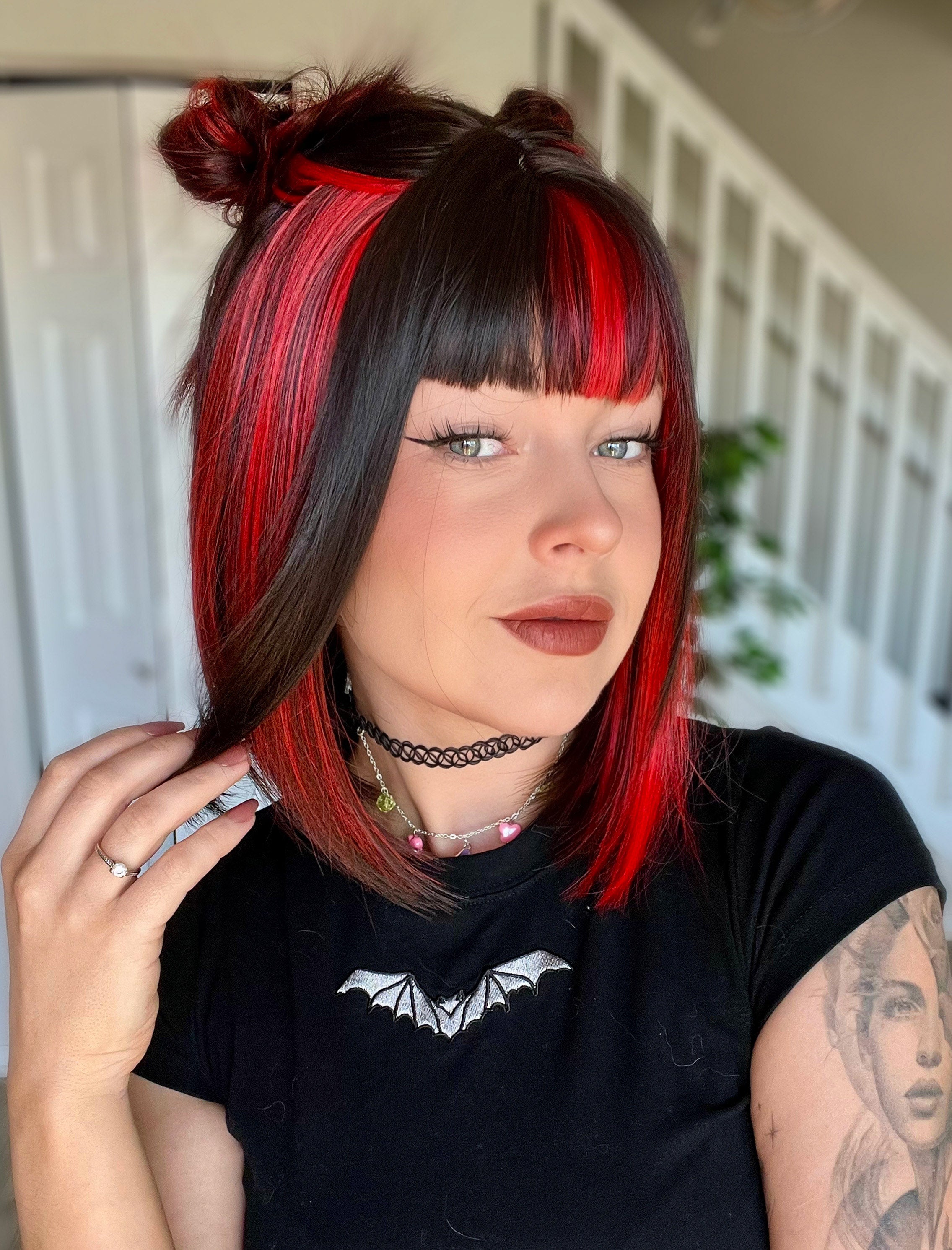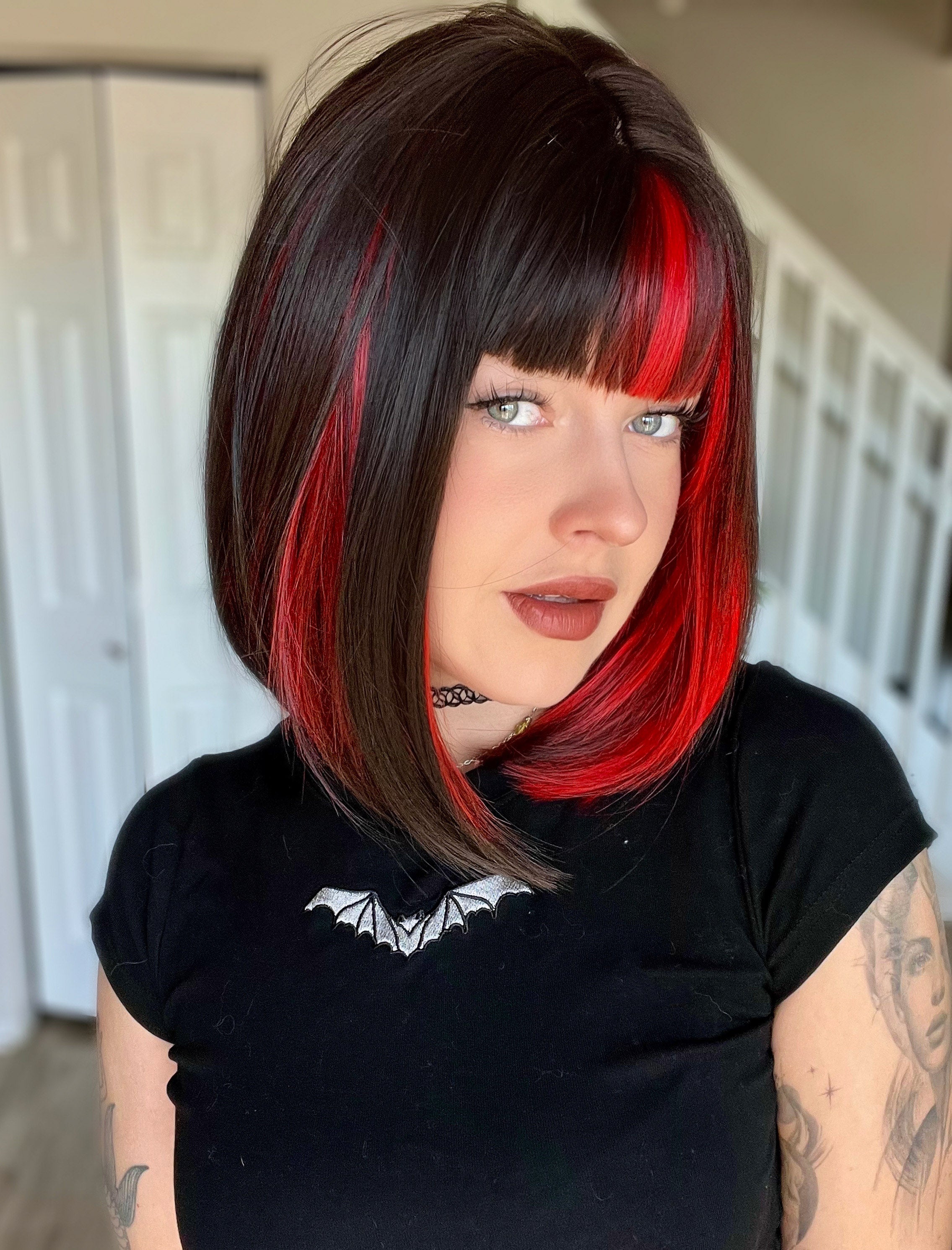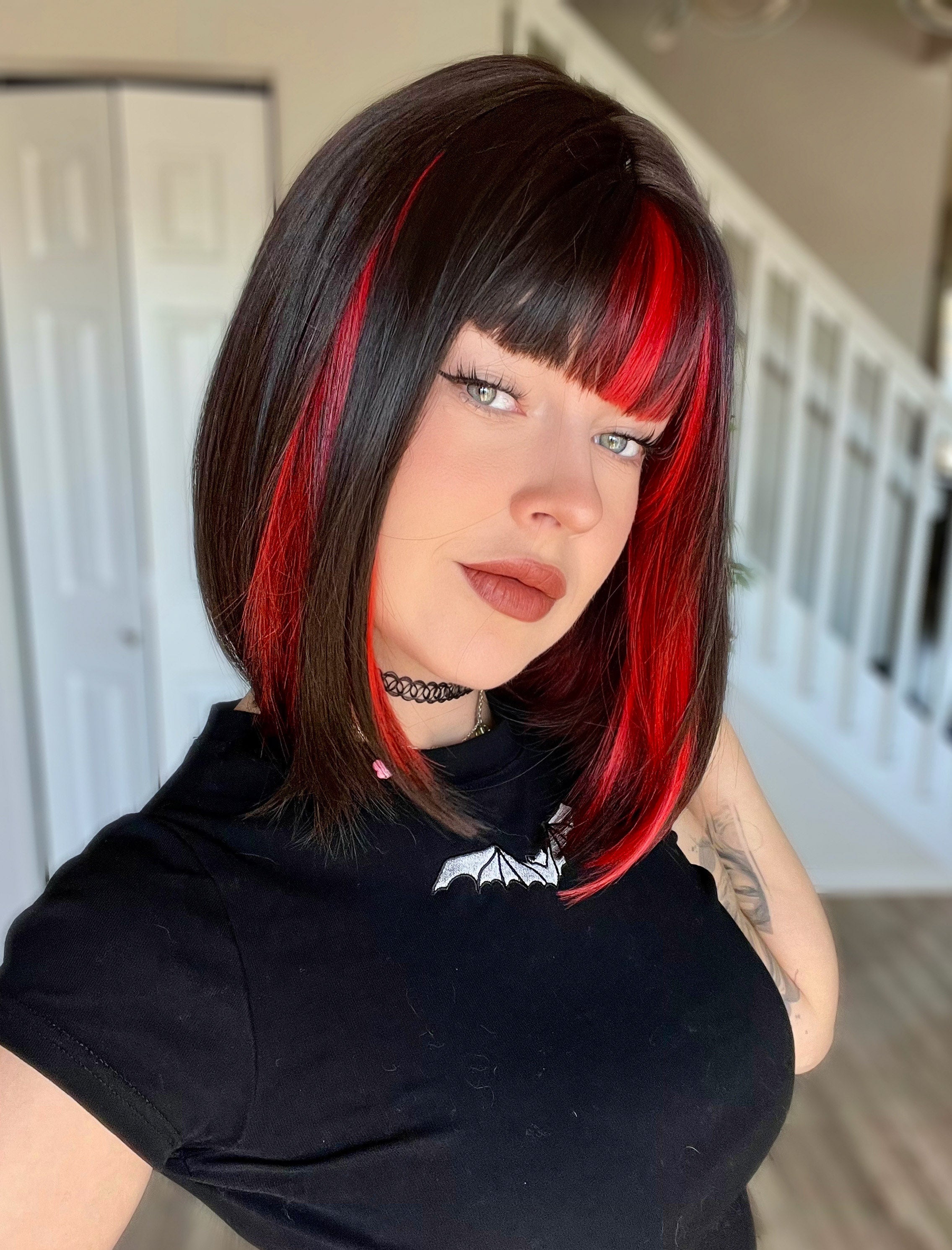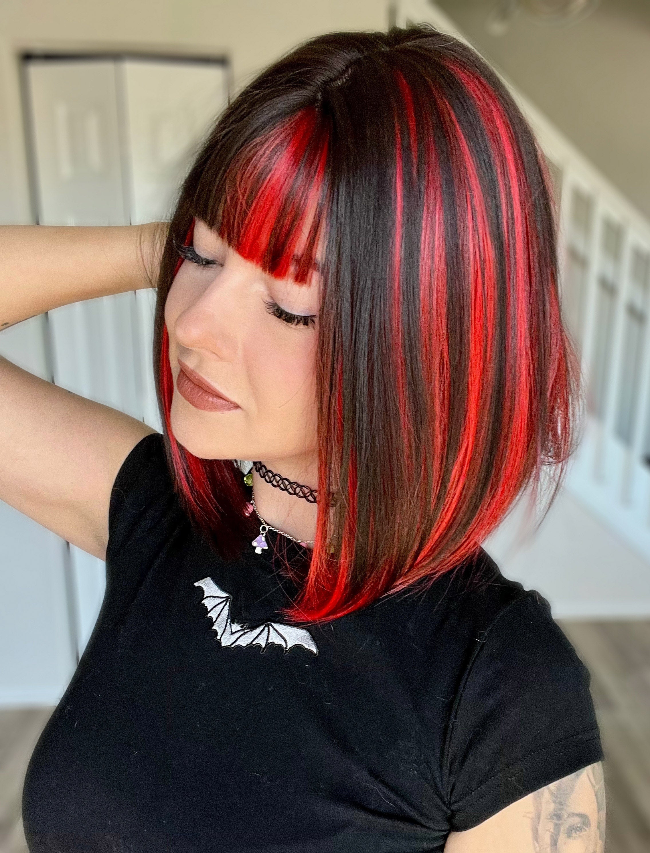 This darkest brown bob features bold red streaks that frame the face for a look that’s as mysterious as it is striking. It’s the ultimate short cut for anyone looking to add a little dark, edgy energy to their collection!