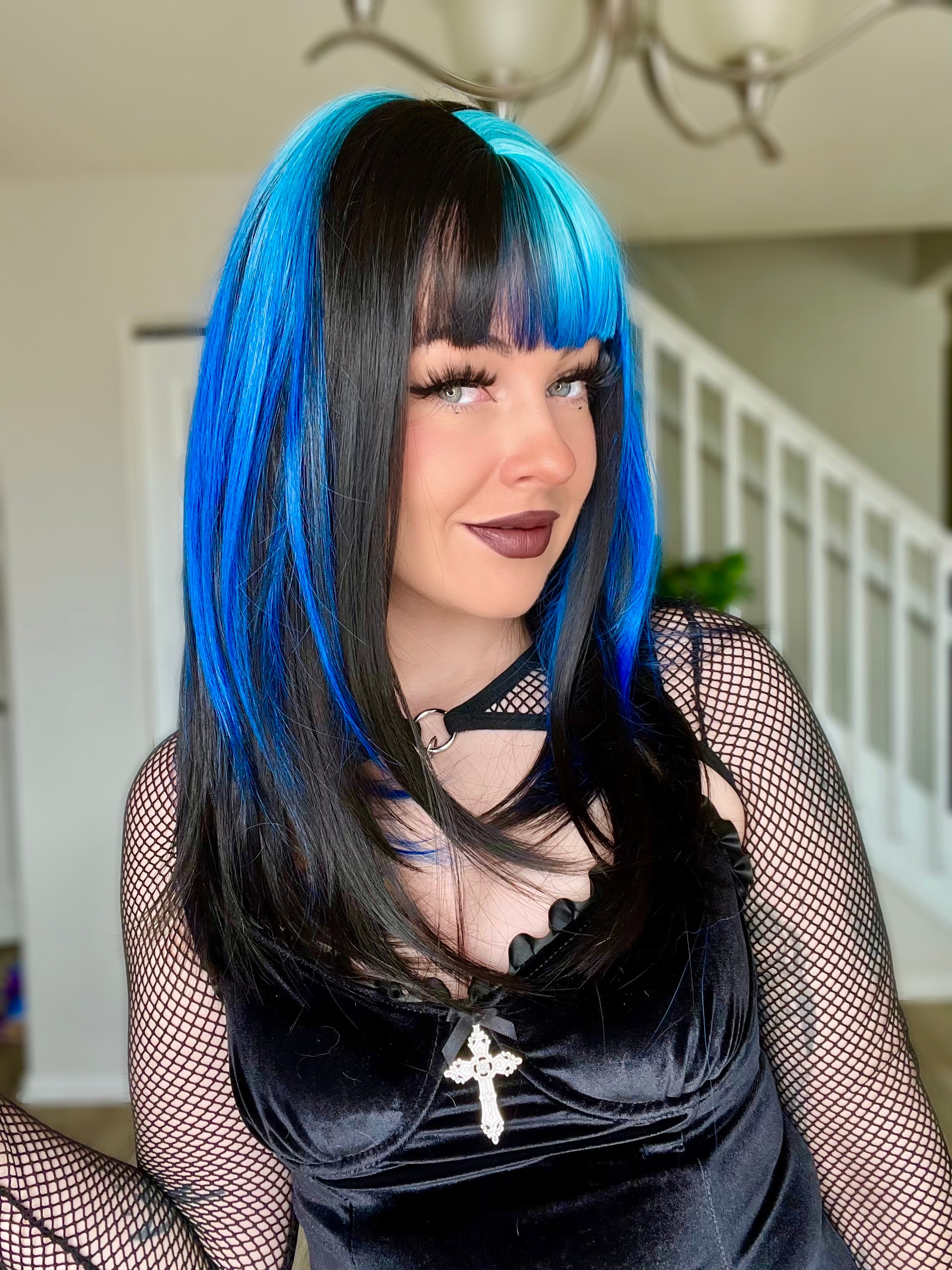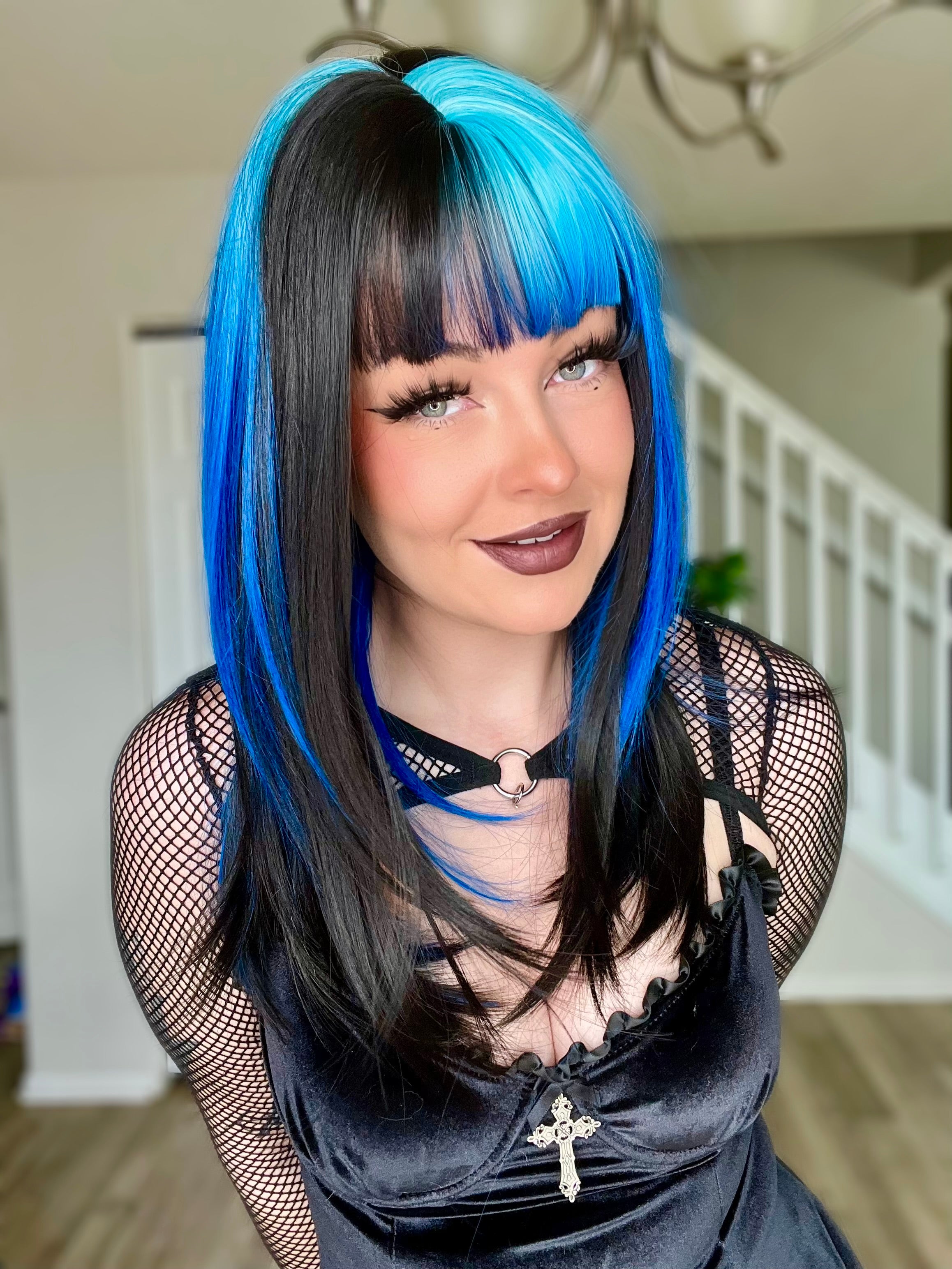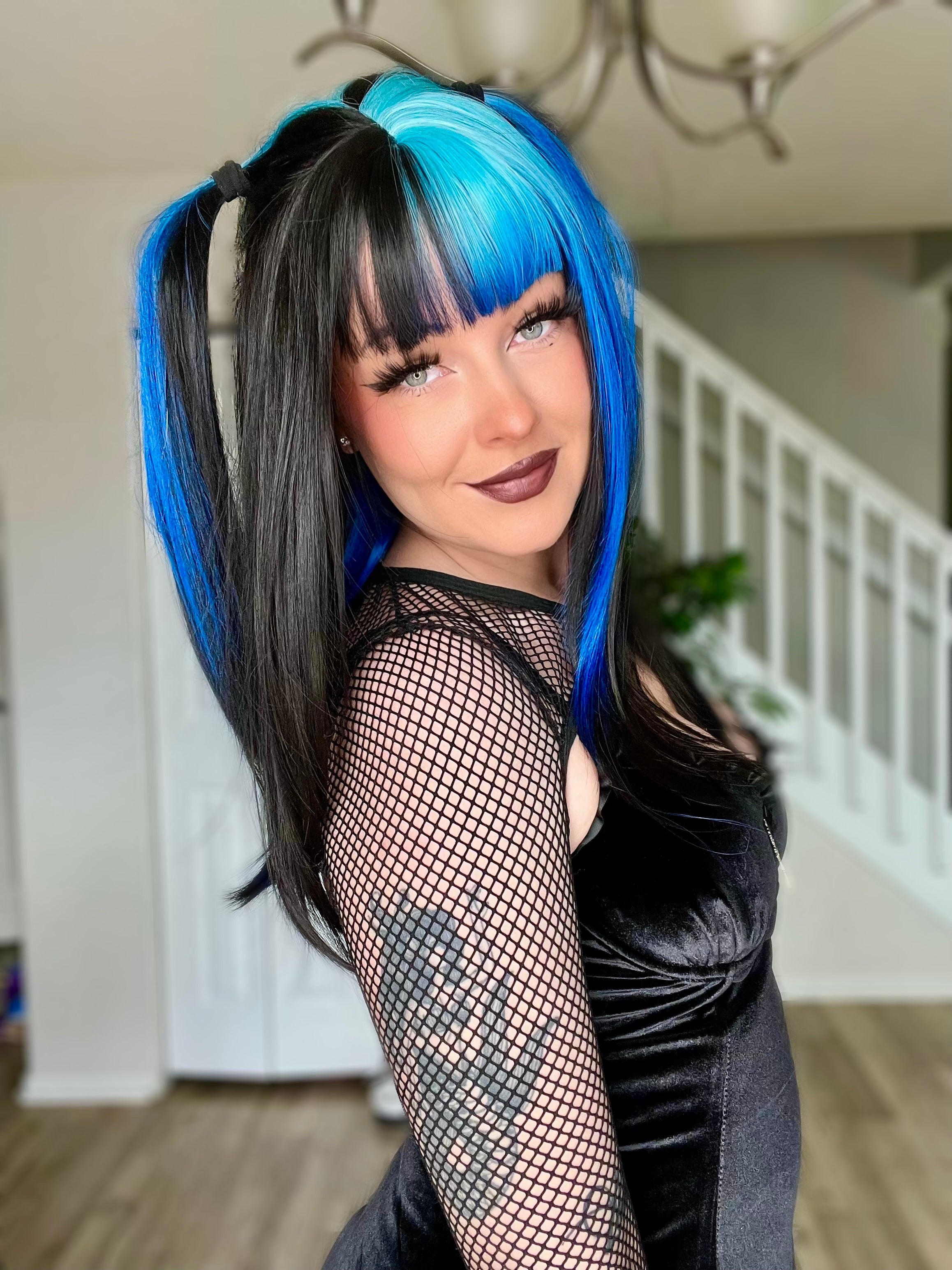 The Orion wig features a striking black and blue color scheme, designed for those seeking a bold aesthetic. The blend of colors allows for versatile styling options, enabling you to enhance their appearance with ease and confidence!